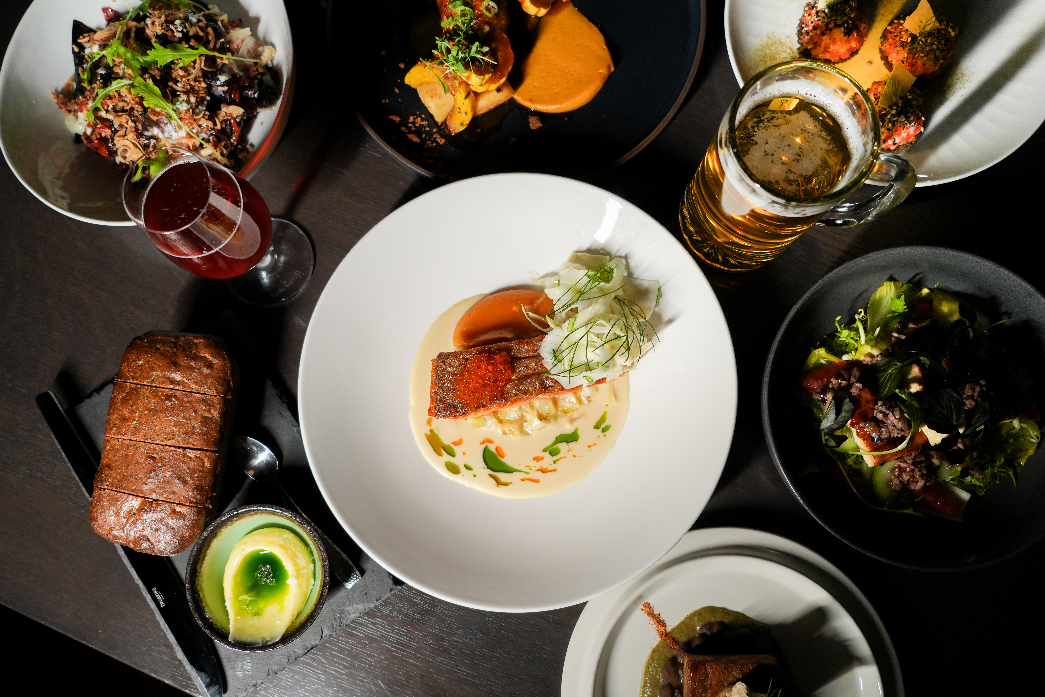 Functioning as both a comfortable tasting room and lively venue under the direction of Executive Chef James Bingham, The Bar showcases Moody Tongue's collection of perennial beers alongside limited-release offerings from specialty beer programs such as the brewery's Farmers Market Series and whiskey or wine barrel-aging programs. The Bar's high-end design showcases mid-century modern furniture, creative lighting, a historic library of brewing books and a statement fireplace, all within the preservation of the building’s original industrial features.
